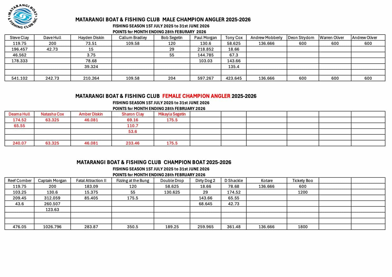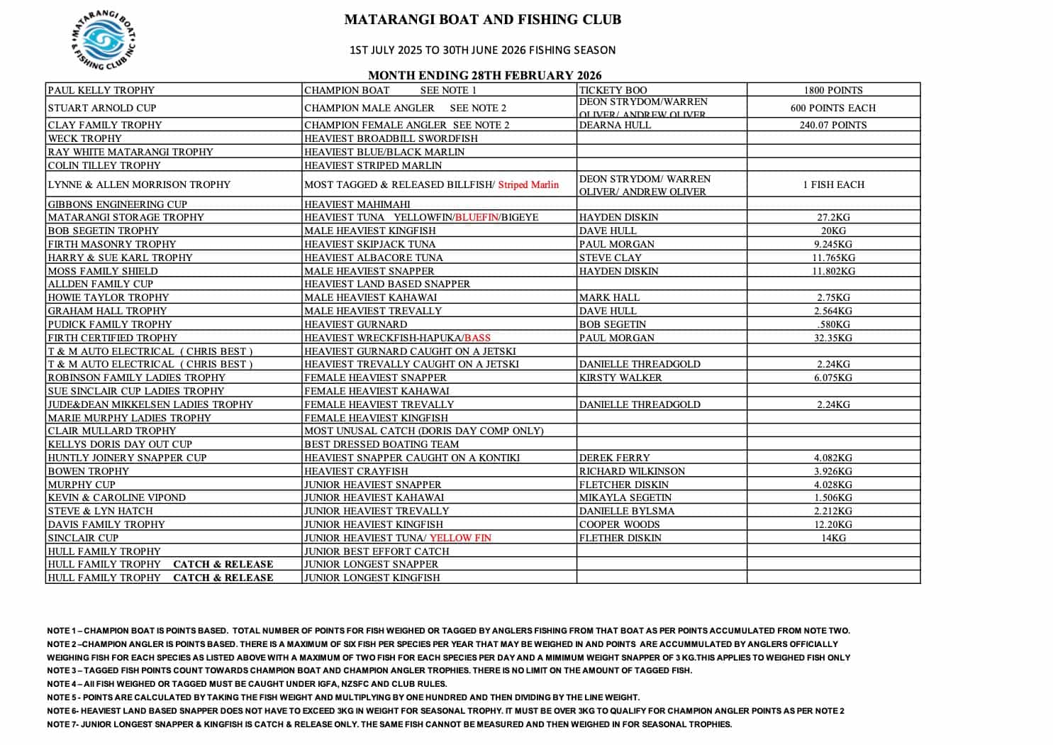 To ensure your fish weights are eligible for yearly trophies, you must be a financial member of the current fishing season of the Matarangi Boat and Fishing Club Inc. All weights contribute to points for Champion Angler and Champion Boat, and the heaviest fish in each category will win trophies for the current fishing year (July 1st - June 30th).
