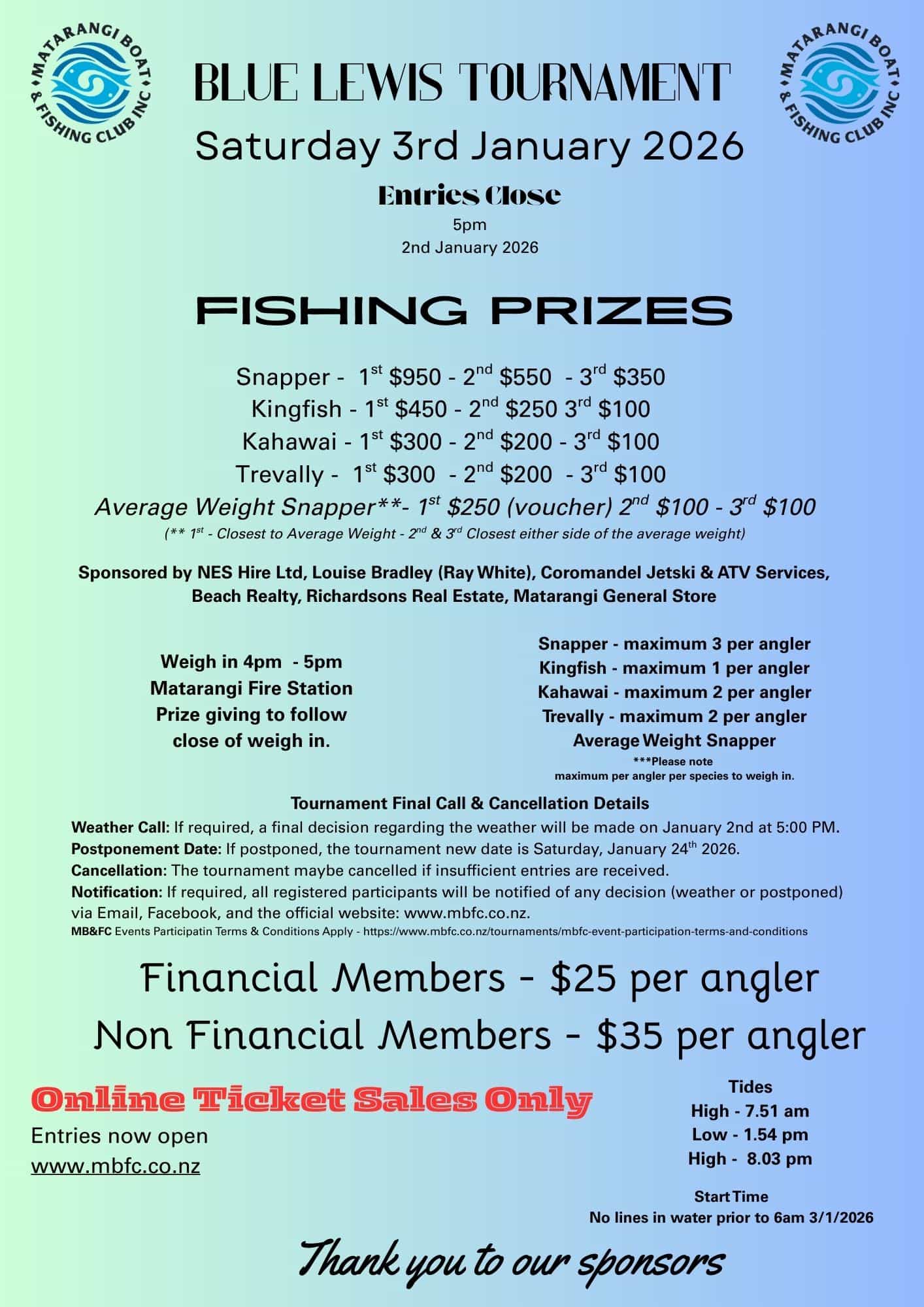 This annual tournament has been renamed the Blue Lewis Tournament. Blue was one of the founding members of our fishing club and was an avid supporter of the club and local stalwart of the community, right up to his passing last year. The committee felt it was only fitting to rename this tournament in his honour.