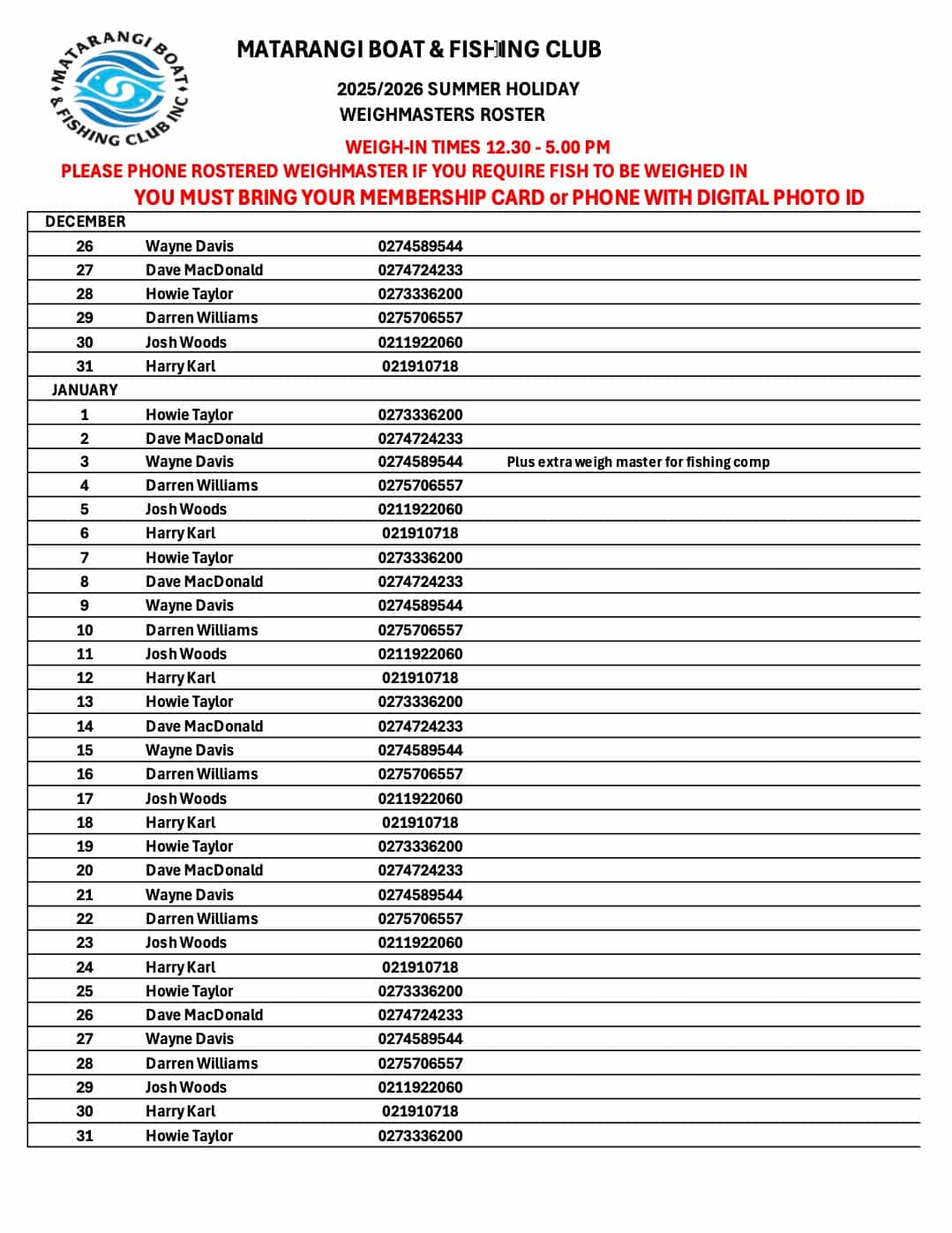 To ensure your fish weights are eligible for yearly trophies, you must be a financial member of the current fishing season of the Matarangi Boat and Fishing Club Inc. All weights contribute to points for Champion Angler and Champion Boat, and the heaviest fish in each category will win trophies for the current fishing year (July 1st - June 30th).